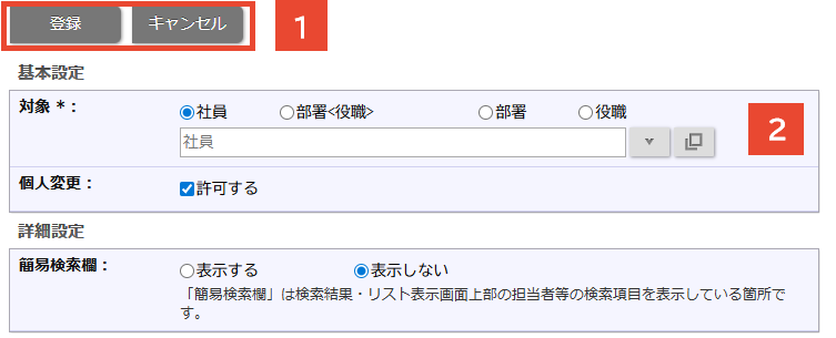 | 対象 | 基本設定を反映する社員、部署<役職>、部署、役職を選択します。 ※編集時は変更できません。 |