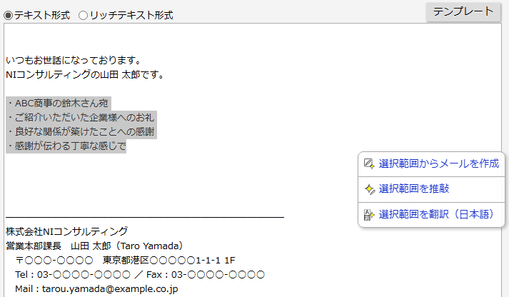 - 生成AIでメール本文を自動で作成した場合、テンプレート提案機能とは連動しません。