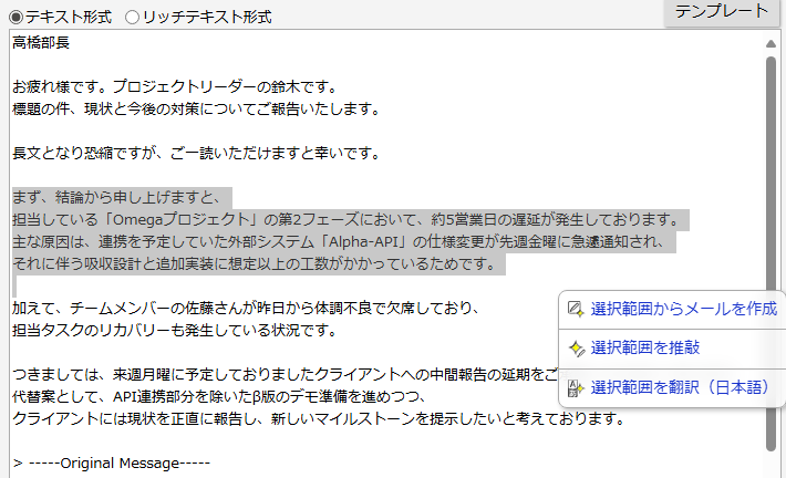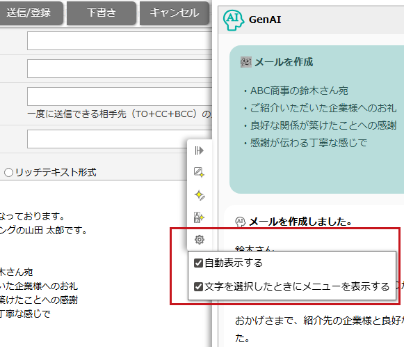 さらに、生成AIが表現や構成の改善を支援し、メール文書の質の向上も図ります。