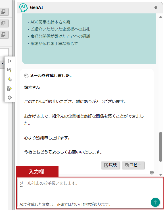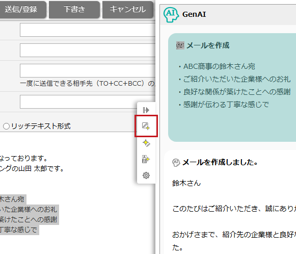 すると、生成AIがメールの文章を自動で作成します。 - 作成された文章はアシストパネルのGenAI欄に表示されます。