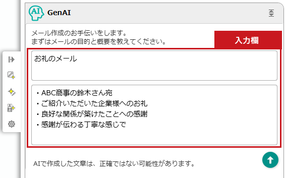 入力欄にメールの目的や伝えたい内容の概要を入力し、生成AIを利用してメール文書を自動生成します。