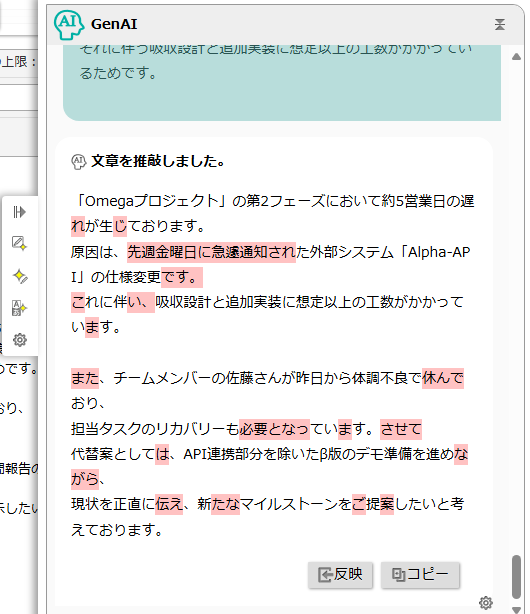 すると、生成AIが選択した文章を推敲します。 - 推敲した結果はアシストパネルのGenAI欄に表示されます。