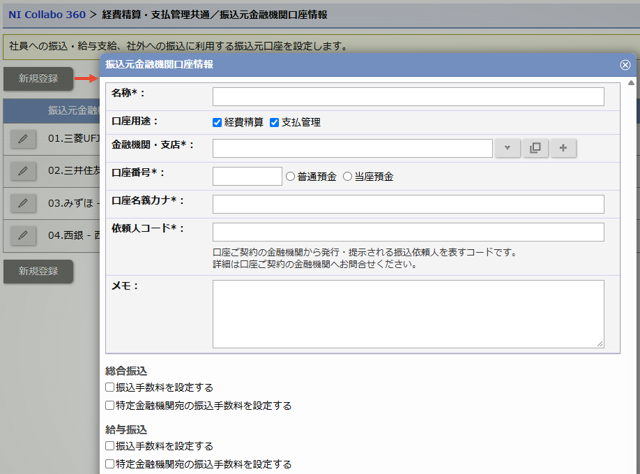 ⇒「経費精算・支払管理共通/振込元金融機関口座情報」画面が表示されます。 - 「新規登録」ボタンをクリックし、内容を入力します。