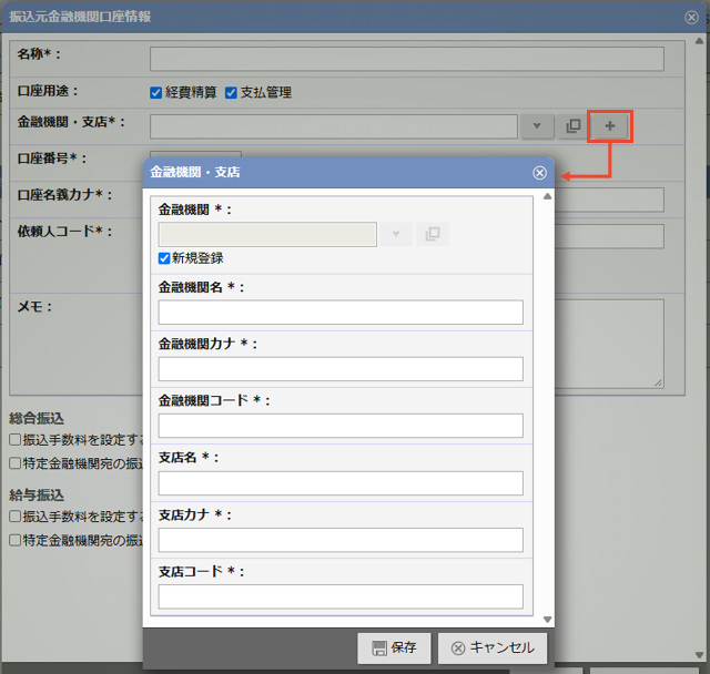 - 「金融機関・支店」の項目にある「+」(新規登録)ボタンをクリックします。