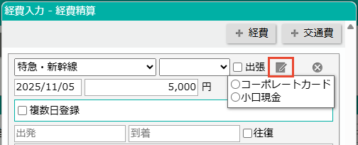 システム設定で「利用する」を選択した支払手段が、経費入力時に選択可能になります。