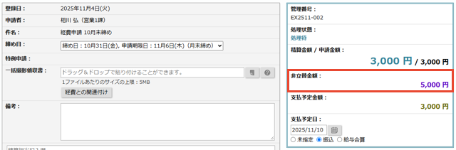 コーポレートカード・小口現金が選択された経費は、経費申請画面で「非立替金額」として扱われ、支払予定金額に含まれなくなります。