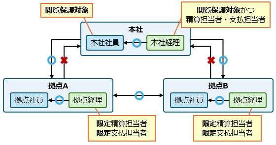 例えば、本社と拠点に経理担当者が在席しており「本社の経理担当者は拠点の経費もすべて参照できるが、拠点の経理担当者は拠点の経費のみ参照できる」といった使い方ができます。
