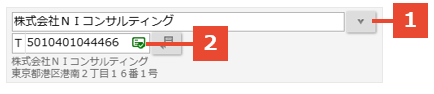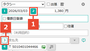 | 支払先 | 支払先を入力します。 過去に登録した支払先は、入力候補から選択できます。(①) 登録番号を利用している場合、登録番号も自動セットされます。(②) ![]() |