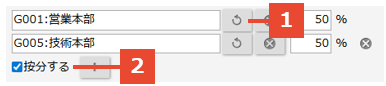 | 計上部門 | 各種マスタをサジェストから選択します。![]() ・最近選択したマスタは候補から選択できます。(①) ・「按分する」にチェックを入れると按分入力ができます。(②) 連携先マスタが顧客情報(SFA)・案件情報(SFA)の場合、経費利用日の商談情報・業務情報にセットされた顧客情報・案件情報が最近選択の候補に表示されます。 上記以外の連携先マスタでは、過去に登録した経費にセットされたものが候補に表示されます。 ※システム設定「NI Collabo 360 > 経費精算・支払管理共通/マスタの基本設定」の「表示する画面」で「経費入力」のチェックを入れている項目のみが表示されます。 |