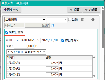 複数日にわたる出張の日当登録など、同一内容の経費を一括登録したい場合に使用します。