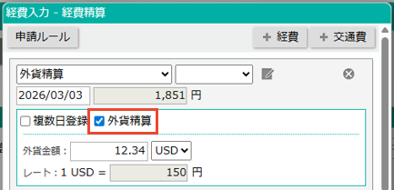 - 外貨精算にチェックを入れると専用の入力欄が展開されます。