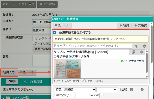 登録済みの経費と一括撮影領収書を関連付けたい場合は「一括撮影領収書」を参照してください。 - 「一括撮影領収書を添付する」にチェックを入れて保存すると、同じダイアログ内で入力した経費が自動的に関連付けられます。
