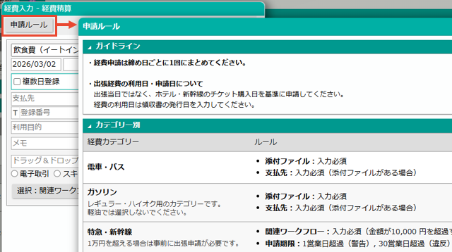ガイドラインや経費カテゴリーごとの説明・必須項目などを「申請ルール」ボタンから確認できます。