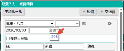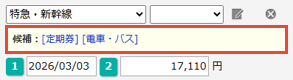電車と推測されるカテゴリーを選択している場合、出発・到着に入力した区間の金額候補を表示します。