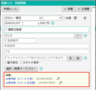 出張申請や購入稟議などから、経費の利用日・金額に近いものが候補表示されます。