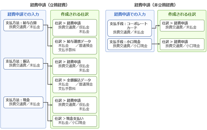 仕訳タブの各画面から作成される仕訳と、前提となる経費申請での入力について説明します。