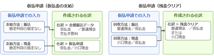 振込の場合は、後述する「仕訳 > 全銀振込データ」で仮払金支給の仕訳を作成します。 - 借方は、システム設定「仮払金の仕訳」で指定した科目・税区分で計上します。