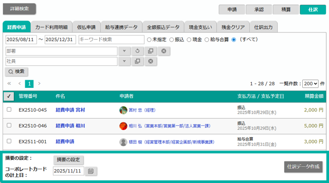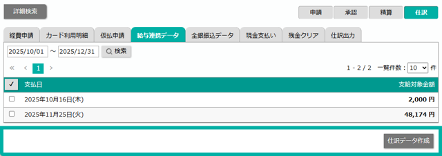 仕訳タブにある「経費申請」「カード利用明細」「仮払申請」「給与連携データ」「全銀振込データ」「現金支払い」「残金クリア」のタブから、会計ソフトに連携する仕訳データを作成します。各画面の操作はすべて共通です。