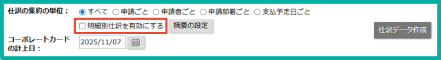 システム設定「経費精算/基本設定」の「仕訳の集約」を「借方・貸方を集約する」に設定している場合、明細別仕訳を指定できます。