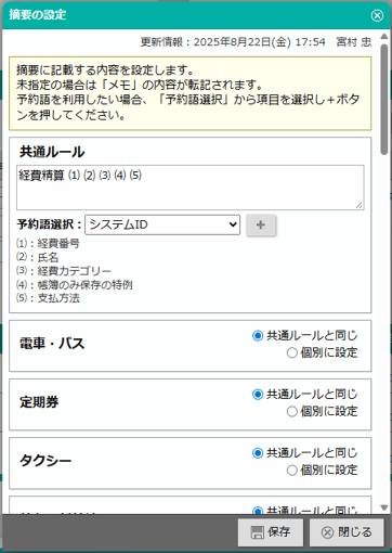 - 予約語選択から摘要に転記したい項目を選択して「+」(追加)ボタンをクリックすると、摘要欄に反映されます。