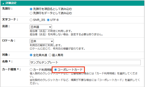 - 一括取込(カード利用明細)でカード種類を「コーポレートカード」で取り込んだ経費