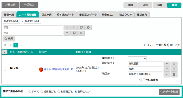 選択しているカード利用明細すべてを1つの仕訳として集約します。仕訳の計上日に操作日、メモに仕訳元名がセットされます。 - 担当者ごと