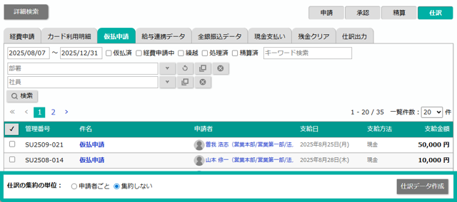 - 「仕訳の集約」で「借方・貸方を集約する」以外を設定している場合、仕訳伝票は経費申請の単位で分かれます。