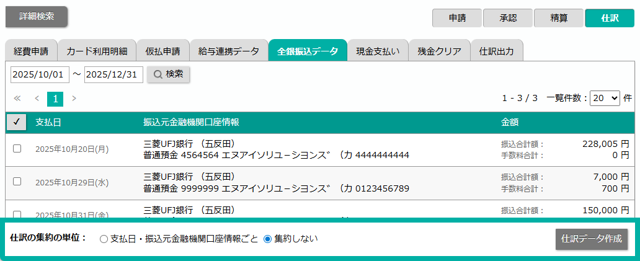 「仕訳の集約の単位」は、仕訳の「取引行」の区切りを指定するものです。取引行は、一般的な会計ソフトの仕訳伝票に該当します。仕訳伝票を区切りたい単位で、集約の単位を指定してください。- 支払日・振込元金融機関口座情報ごと