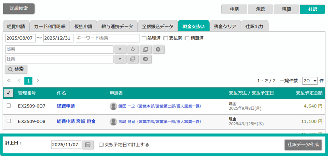 ⇒「仕訳(現金支払い)」- 仕訳の対象となるのは、支払方法に現金を指定した経費申請です。