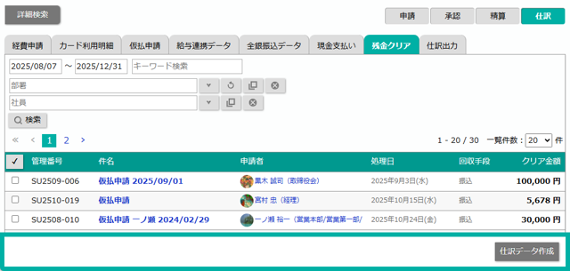 - 仕訳を「利用する」で指定して残金クリアを実行した仮払申請が一覧に表示されます。