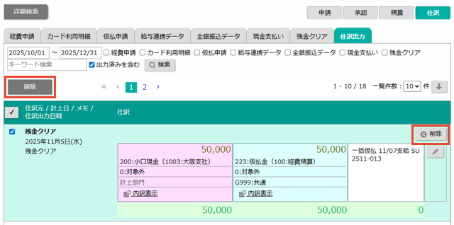 「仕訳出力」タブにて、作成した仕訳を削除できます。