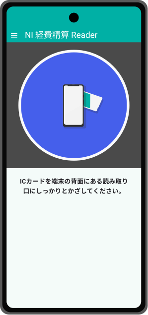 アプリを開いたらICカードを端末の背面にある読み取り口にかざしてください。