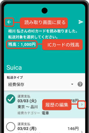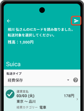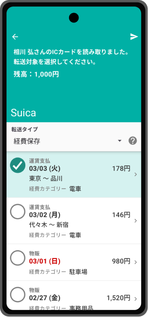 最もシンプルな転送タイプです。転送したデータは経費精算機能にICカードデータとして保存されます。経費への転記はWEB版で確認のうえ行いたい等、データ転送のみを行いたい場合にこちらを選択してください。