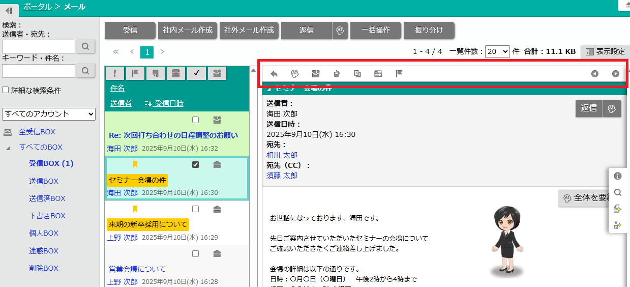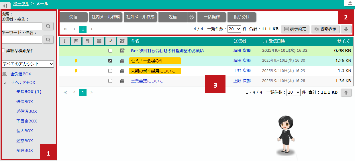 ⇒「メールの一覧画面」 - 左のメールBOX一覧から閲覧するメールが入っているメールBOXを選択します。