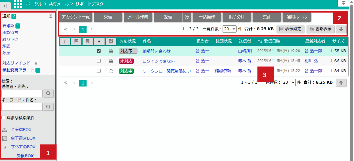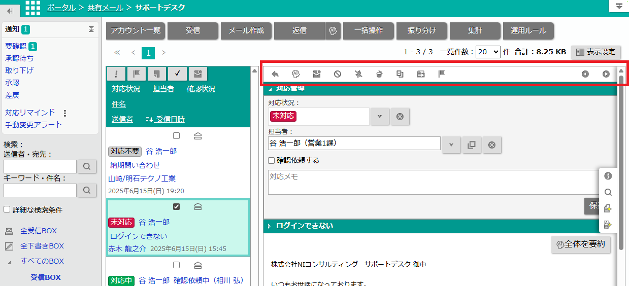 | 対応状況 | メールの対応状況が表示されます。 ※対応管理するアカウント場合、表示される項目です。 |