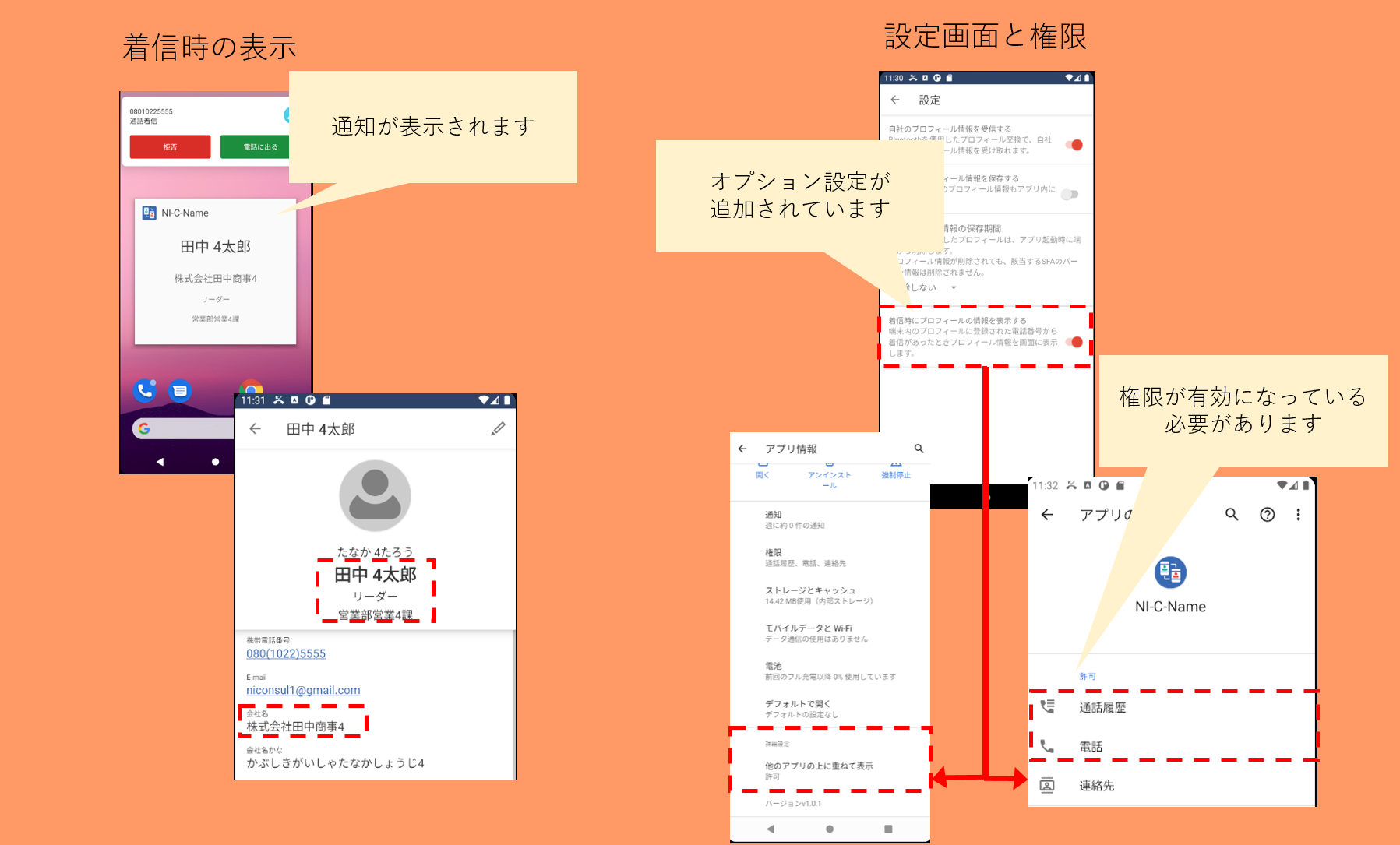 本アプリに登録されているプロフィールの方から電話の着信があった際に、そのプロフィールを画面上に表示するかのオプションです。OSのバージョンによっては、電話や通話履歴への専用の権限が必要になります。
