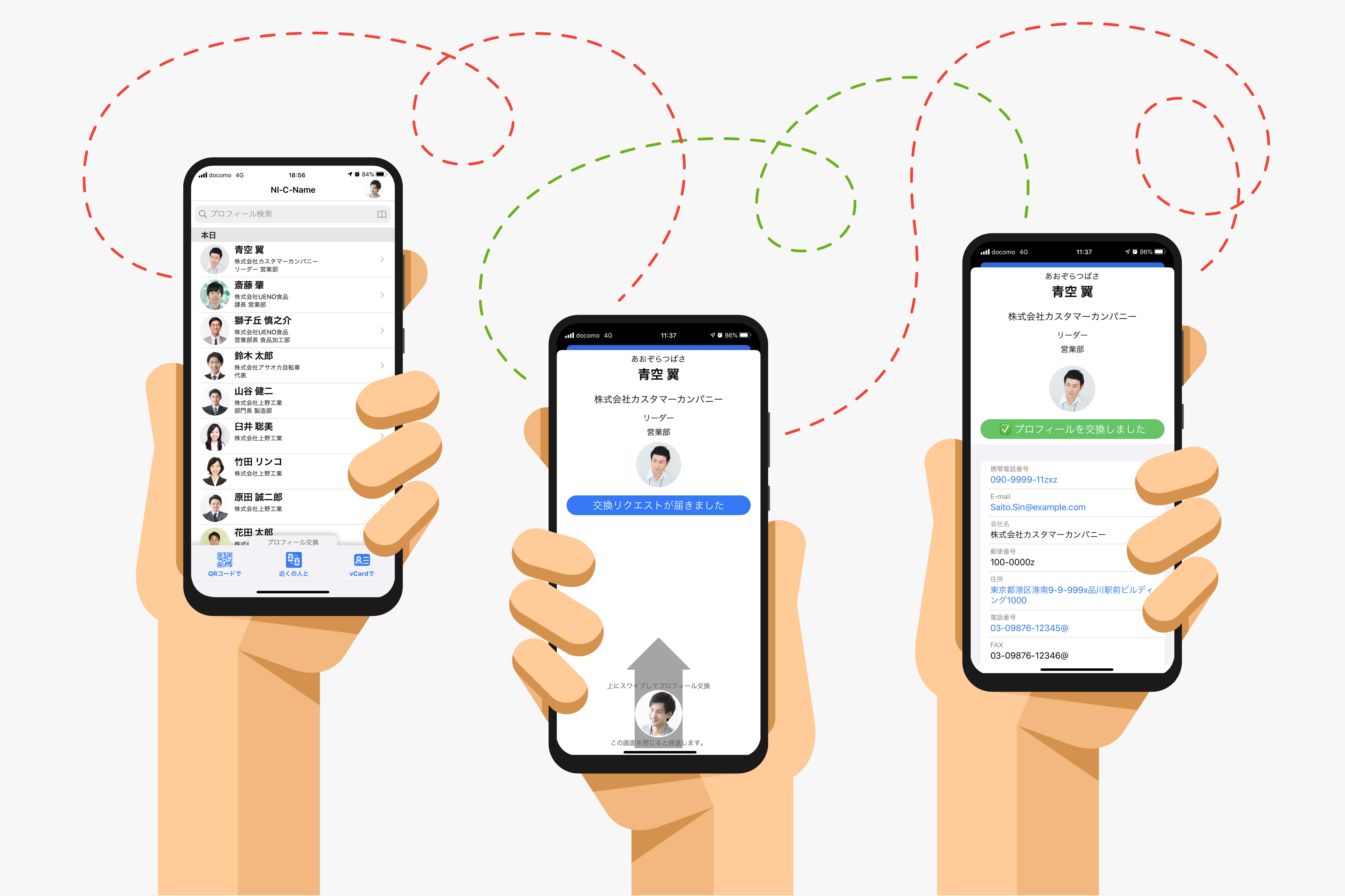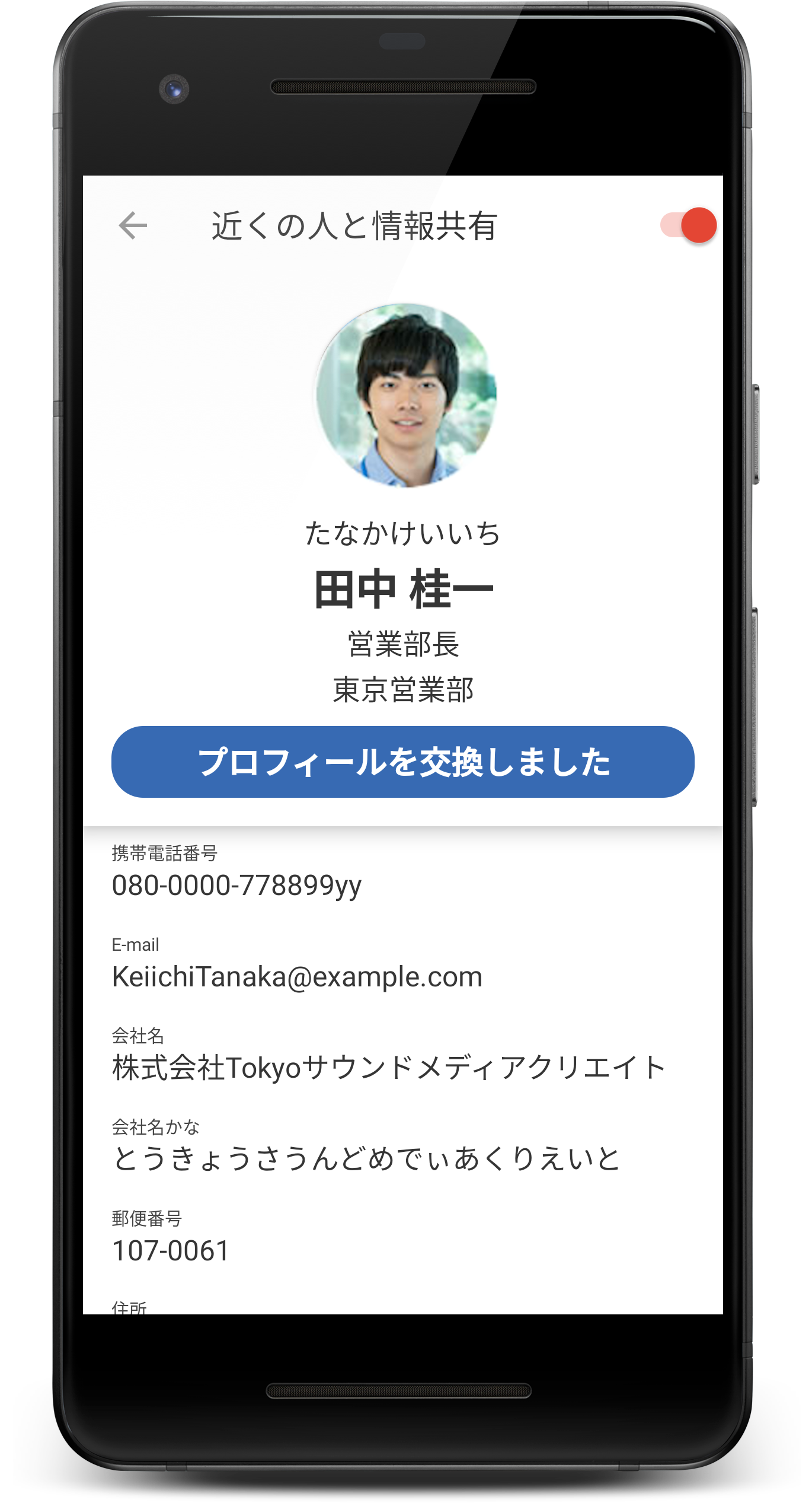 - 交換して入手されたプロフィール情報は、お使いのアプリ内でのみ管理され外部の事業者などにデータが送信されたり公開されることはありません。