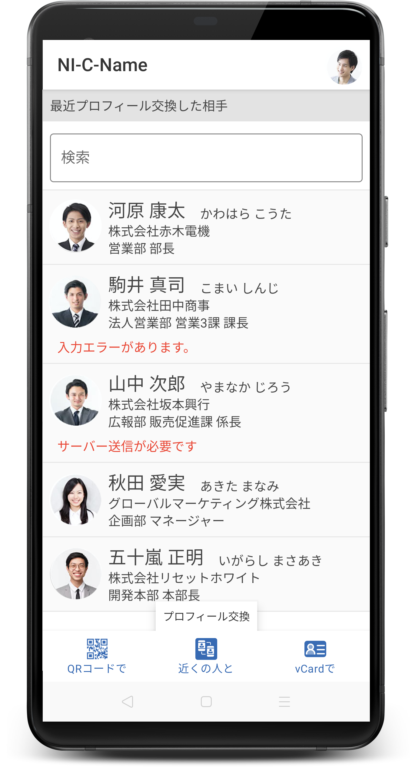 アプリのトップ画面で、交換したプロフィール情報が一覧表示されます。プロフィールをタップするとプロフィール詳細画面が開きます。