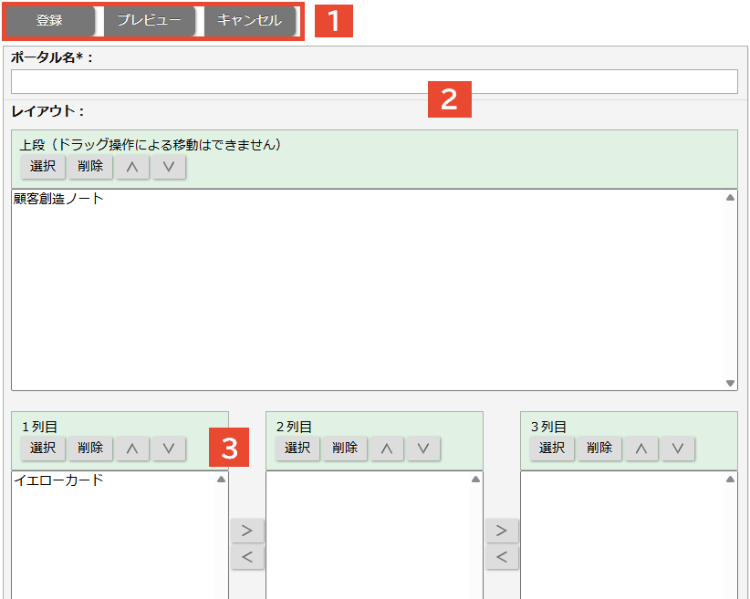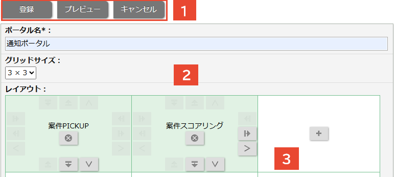 ⇒「ポータル/レイアウト > 新規登録」が表示されます。 - 必要項目を入力、ポータルパーツを配置します。