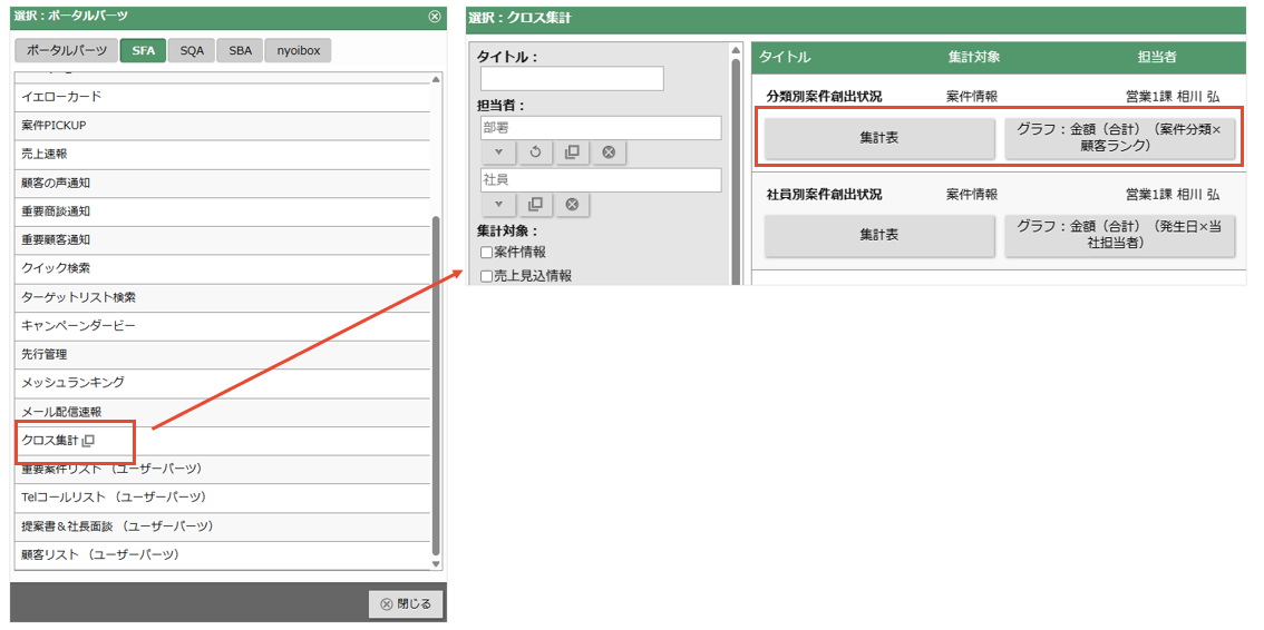 - ポータルパーツ「クロス集計」は、表とグラフを配置することができます。