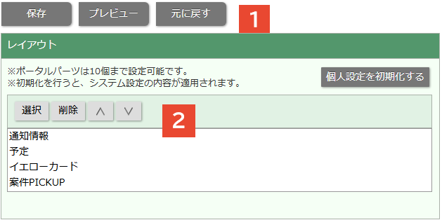 ⇒「ポータル/レイアウト」が表示されます。 - 並び順を変更したいポータルのラジオボタンにチェックをいれます。