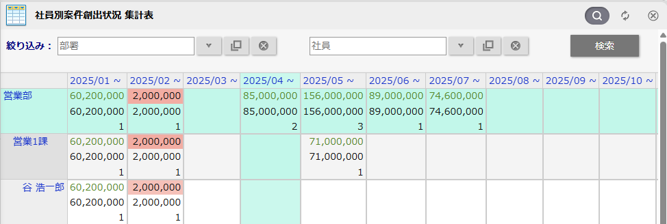 | 1 | 部署または社員で絞り込み欄を表示できます。 |