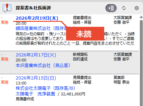 表示幅が広くても最大1,000文字まで表示されます。 - 未読の場合、商談日が太文字になります。