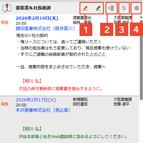 | 2 | 表示方法を省略・展開に切り替えることができます。 展開すると、商談内容が全文表示され、コメント入力できるようになります。 |