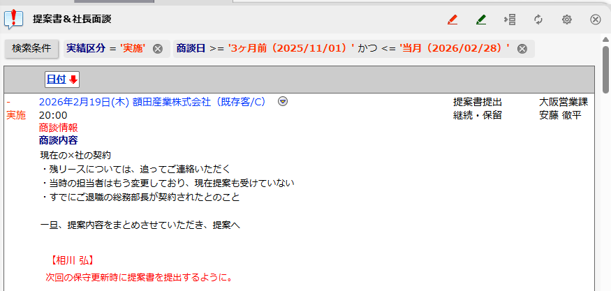 | 次回予定遅延 [顧客][案件] | 実績の商談情報を入力します。 イエロー通知されている予定商談を「実施」として登録することでイエロー通知は消えます。あるいは、商談日を警告対象にならないように変更する、または予定商談を「中止」として保存します。 |
