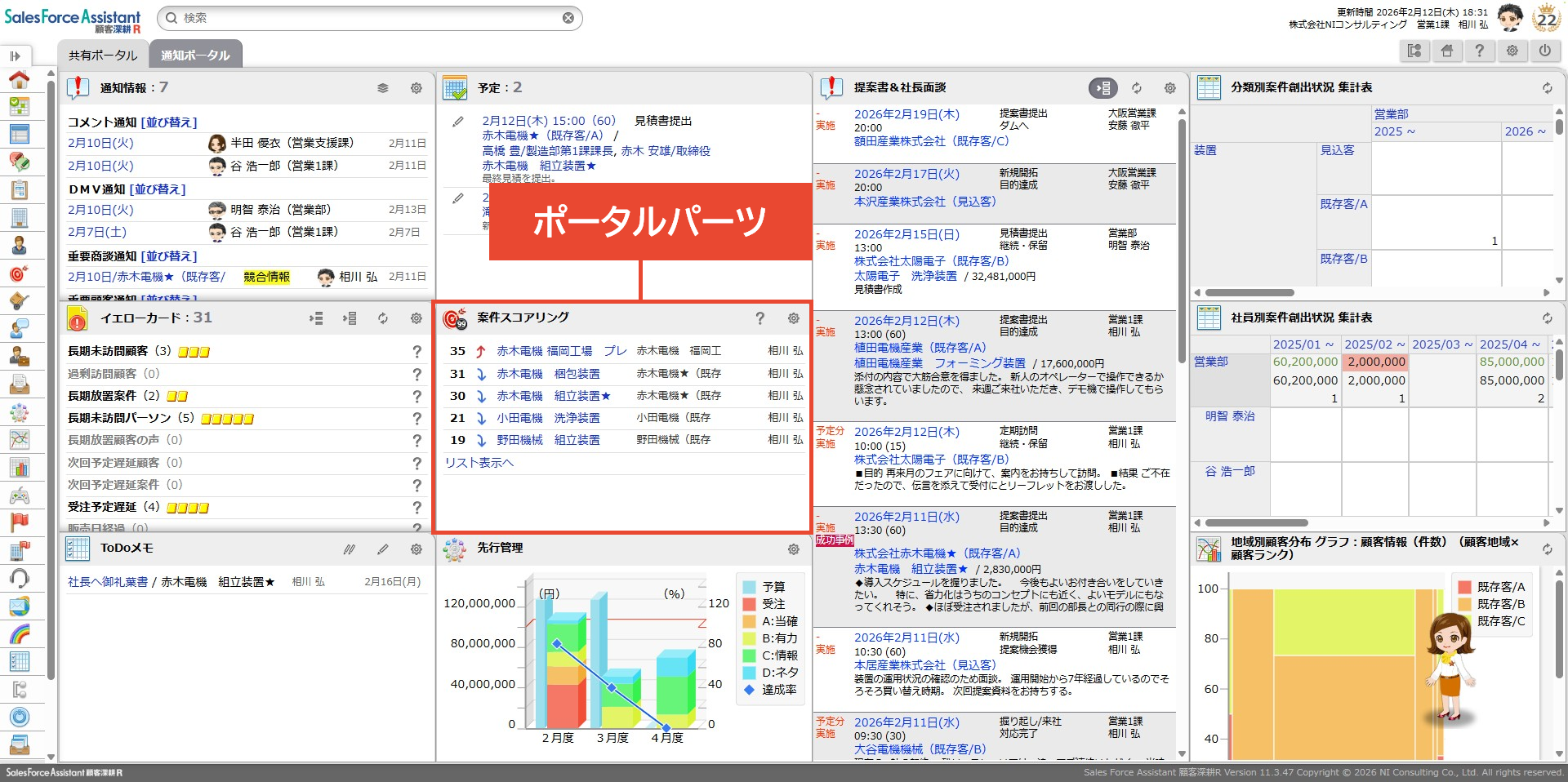 ポータル画面上に表示されている一つ一つのパーツを「ポータルパーツ」と呼びます。用途に合わせたポータルパーツを配置することで、Sales Force Assistantをより使いやすいようにカスタマイズすることが出来ます。